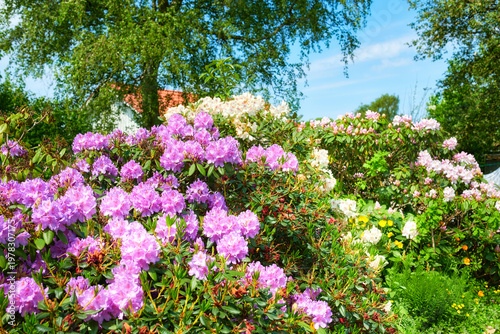 Garden, growth and environment with flowers in nature for spring, eco friendly and blooming. Ecology, sustainability and blossom with rhododendron plants outdoor for ecosystem, floral and foliage