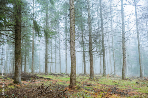 foggy landscape at pine trees forest