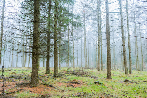 foggy landscape at pine trees forest