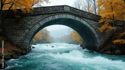 Ancient stone arch bridge above turquoise rapids, framed by autumn forest and misty mountains in a dramatic low-angle wilderness landscape