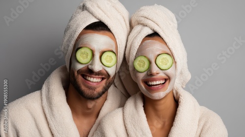 Couple enjoying a facial with cucumber for glowing skin and relaxation at a luxury spa featuring a joyful woman and a man with a fruit beauty mask for wellness and tranquility