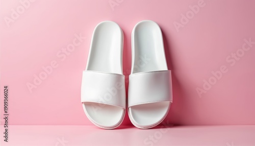 Pair of white slide sandals rests on soft pink surface. Simple modern footwear offers comfort and style for warm weather. Casual summer shoe collection.
