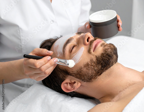 Ein Mann lässt sich von einer Kosmetikerin sein Gesicht behandeln