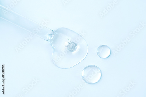 Drop of cosmetics and a pipette on a blue background. A product for skin, face or hair care.
