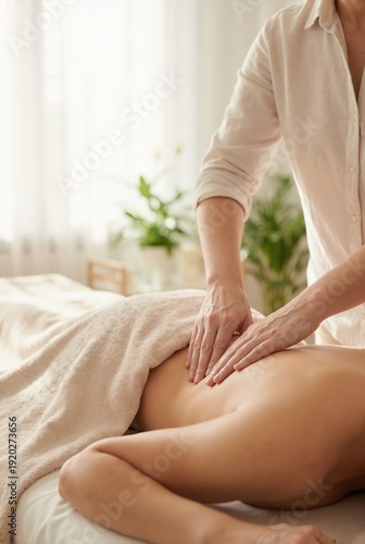 Vertical photo of woman receiving back massage in spa. Professional therapist performing body care treatment. Wellness and health