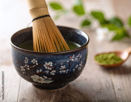 Traditional matcha green tea preparation in a floral ceramic bowl with a bamboo chasen whisk. Captures a zen atmosphere, ideal for wellness branding, lifestyle blogs, and spa promotions.