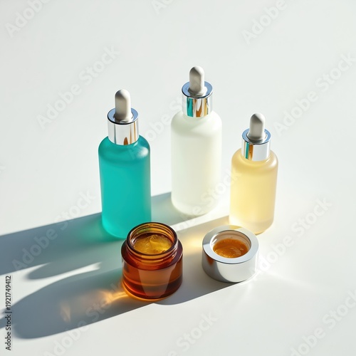 Cosmetic products arranged on a white surface. Bottles with droppers contain blue, white, and yellow liquids. Jars hold golden gel textures, suggesting skincare or beauty treatments.
