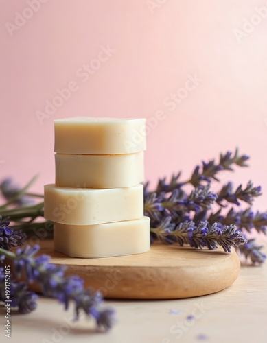 Stacked natural handmade soap bars with lavender flowers beside them. Light beige color bars sit on a wooden base. Soft pink backdrop. Clean skin care product.