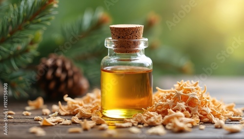 Cedarwood oil in small glass bottle with cork stopper, pile of cedarwood shavings, pine branches, cone on rustic wood table. Natural aromatherapy wellness product.