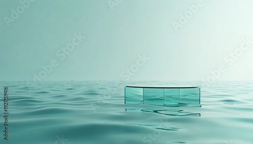 Transparent glass podium floats on turquoise water waves. Minimalist display platform offers serene backdrop for product presentation. Modern clean aesthetic for commercial use.