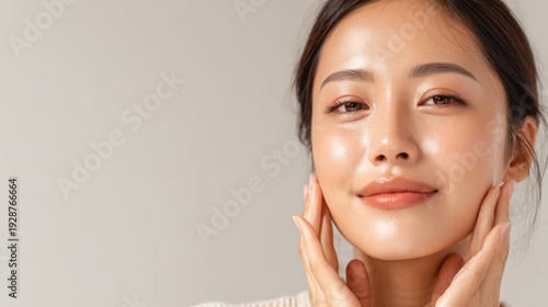 A premium image of skincare and cosmetics featuring a woman with clear skin offering room for text