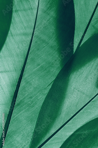 Aesthetic nature close up pattern from bird feathers, natural texture as organic background, biological design concepts. Vivid monochrome green gradient. Minimal style nature wallpaper, backdrop.