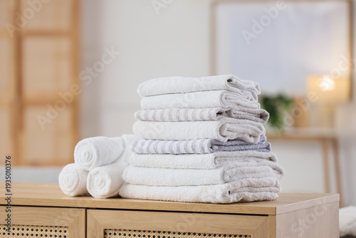 Stack of clean towels on commode in room