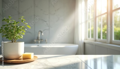 Sunlight streams into modern bathroom with marble countertop. Potted plant, soap bar on wooden tray near bathtub. Bright, clean, spa like space.