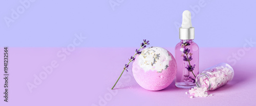 Lavender essential oil, bath bomb and sea salt on color background