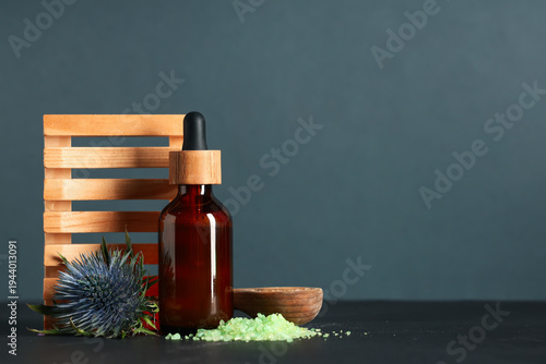 Beautiful spa composition with heap of sea salt, flower and bottle of cosmetic product on grey background, closeup