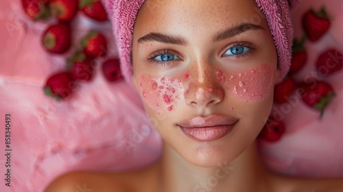 A woman with blue eyes relaxes with a strawberry face mask on a pink background.