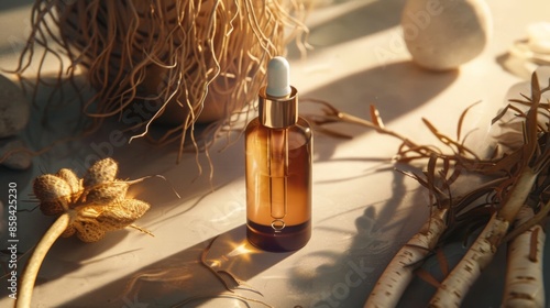 Glass dropper bottle with golden cap on white surface, surrounded by dried plants and branches. Warm light shines on bottle and reflects on surface.