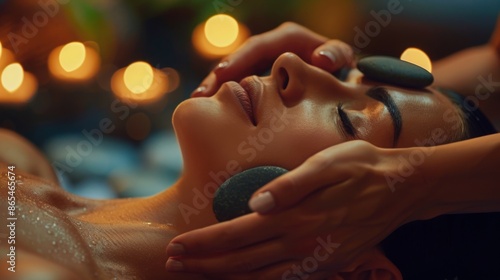 A woman is receiving a hot stone facial massage, with a therapist gently applying a smooth, heated stone to her cheek. The setting is dimly lit and relaxing, with candles in the background.