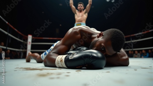 A boxer lying in a boxing ring with the winning boxer in the background.