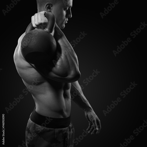 Cropped shot of young bodybulder holding a kettle bell Strong fitness male exercising crossfit with kettlebell in gym