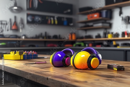 Colorful headphones resting on a wooden workbench surrounded by tools and supplies
