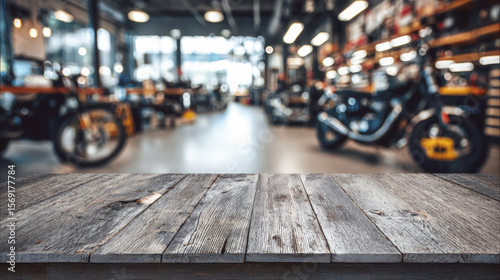 Empty wooden table in motorcycle garage workshop with blurred background.