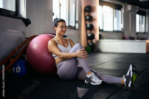 Smiling athletic woman relaxing after sports training in gym.