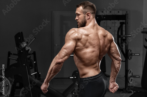 Rear view muscular man showing back muscles at the gym. Strong male naked torso, workout