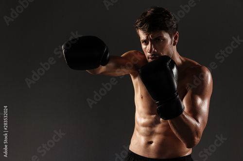 Handsome young strong sportsman boxer in gloves make exercises boxing isolated over black wall background.