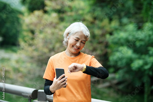 Happy athletic Senior woman checking her smartwatch in the park