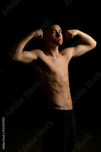 Nineteen year old teen boy flexing his arms