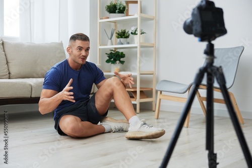 Man athlete blogger records exercise training on the body at home on camera, sports blogger bodybuilder, the concept of health and beauty