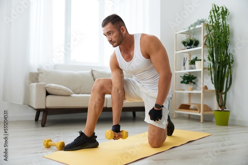 Man sports home training on the floor on a mat with dumbbells, exercises for muscle growth, pumped up man fitness trainer exercises at home, the concept of health and beauty of the body