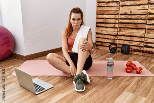 Young redhead woman watching training tutorial at the gym depressed and worry for distress, crying angry and afraid. sad expression.