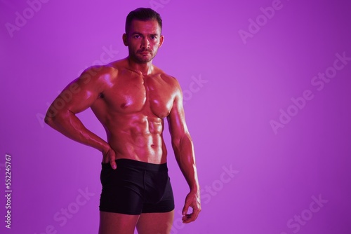 Man athletic body bodybuilder in briefs with nude torso abs full-length in the background fitness classes, purple colored light. Advertising, sports, active lifestyle, competition, challenge concept.