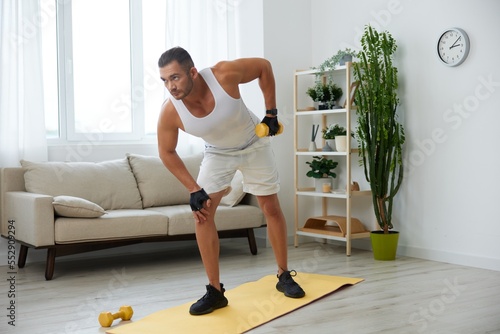 Man sports home training on the floor on a mat with dumbbells, exercises for muscle growth, pumped up man fitness trainer exercises at home, the concept of health and beauty of the body