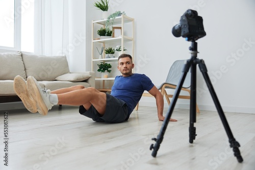 Man athlete blogger records exercise training on the body at home on camera, sports blogger bodybuilder, the concept of health and beauty