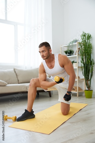 Man sports home training on the floor on a mat with dumbbells, exercises for muscle growth, pumped up man fitness trainer exercises at home, the concept of health and beauty of the body