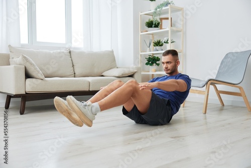 Man sportsman training at home, push-up exercises for arm, leg and back muscles, strong body and correct posture, the concept of health and beauty