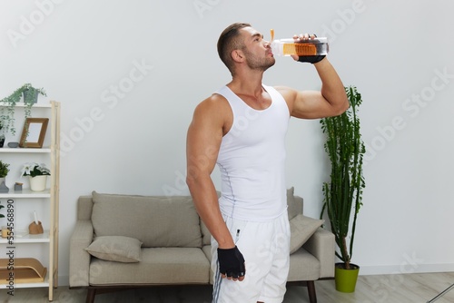 Man sports drinking water during break from workout, pumped up man fitness trainer works out at home, the concept of health and body beauty
