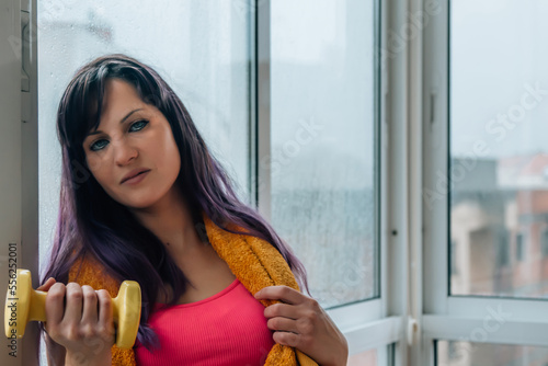 young woman with dumbbells doing exercises at home