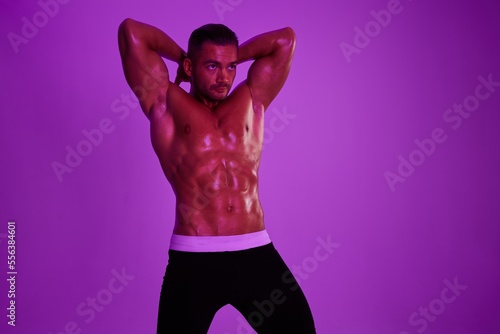 Man athletic body bodybuilder in briefs with nude torso abs full-length in the background fitness classes, purple colored light. Advertising, sports, active lifestyle, competition, challenge concept.
