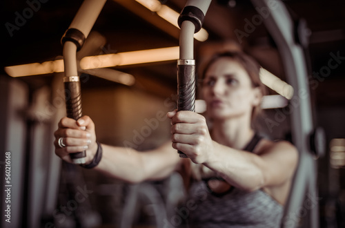 Beautiful fit woman in sportswear trains pectoral muscles in an exercise machine. Healthy lifestyle. Strong body