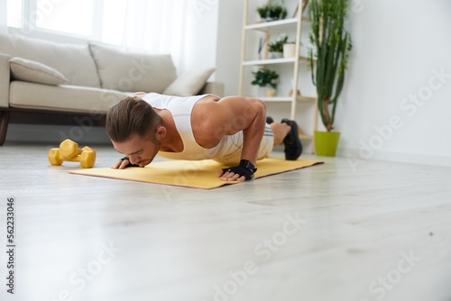 Man sports home training on the floor on a mat with dumbbells, exercises for muscle growth, pumped up man fitness trainer exercises at home, the concept of health and beauty of the body