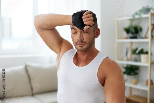 Man sports home training on the floor on a mat with dumbbells, exercises for muscle growth, pumped up man fitness trainer exercises at home, the concept of health and beauty of the body