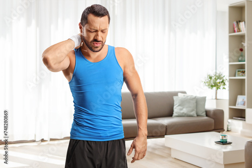Man in sportswear holding his stiff neck