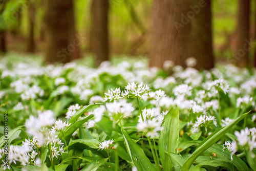 Wild garlic flowers growing in the spring forest. Ramson blossoms, seasonal background