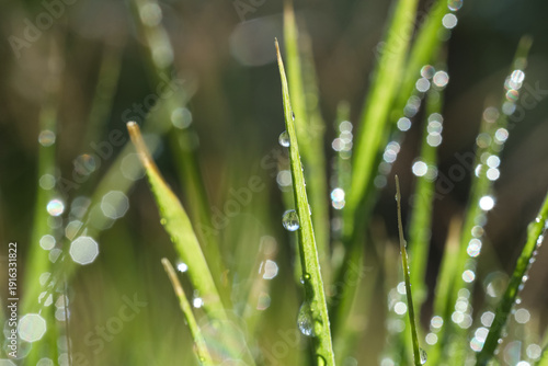 Beautiful green grass with dew on sunny day, closeup
