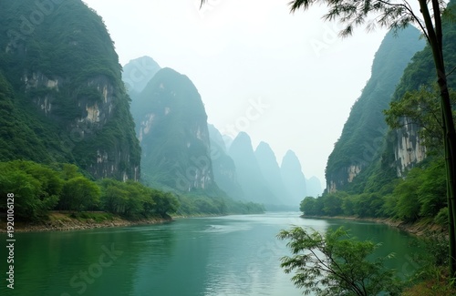 Misty karst mountains rise over green river water. Lush trees cover steep cliffs. Scenic landscape on Li river in China. Calm water reflects sky.